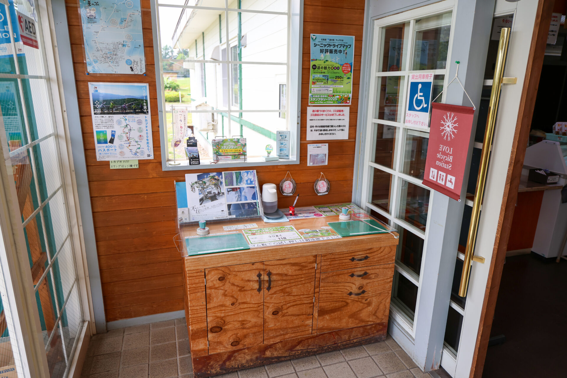 施設入口を入ってすぐの場所にスタンプ台が設置されています。木製の棚の上に観光パンフレットやスタンプラリーの案内も置かれており、鹿追町の観光情報を入手することができます。「シーニックドライブマップ」なども販売されています。