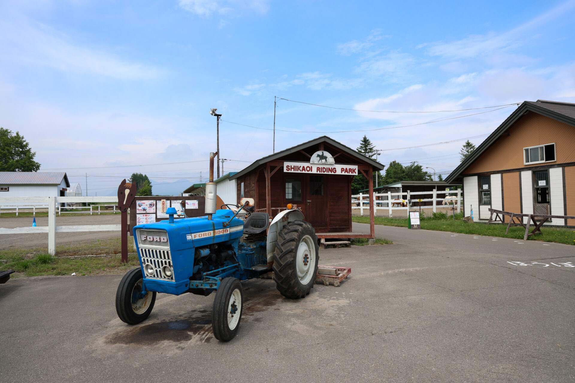 青いFORDのトラクターが目印の入口を抜けると、広大な敷地に馬たちが暮らしています。地面には「ほうぼくじょう」(放牧場)の文字が描かれ、のどかな雰囲気が広がっています。