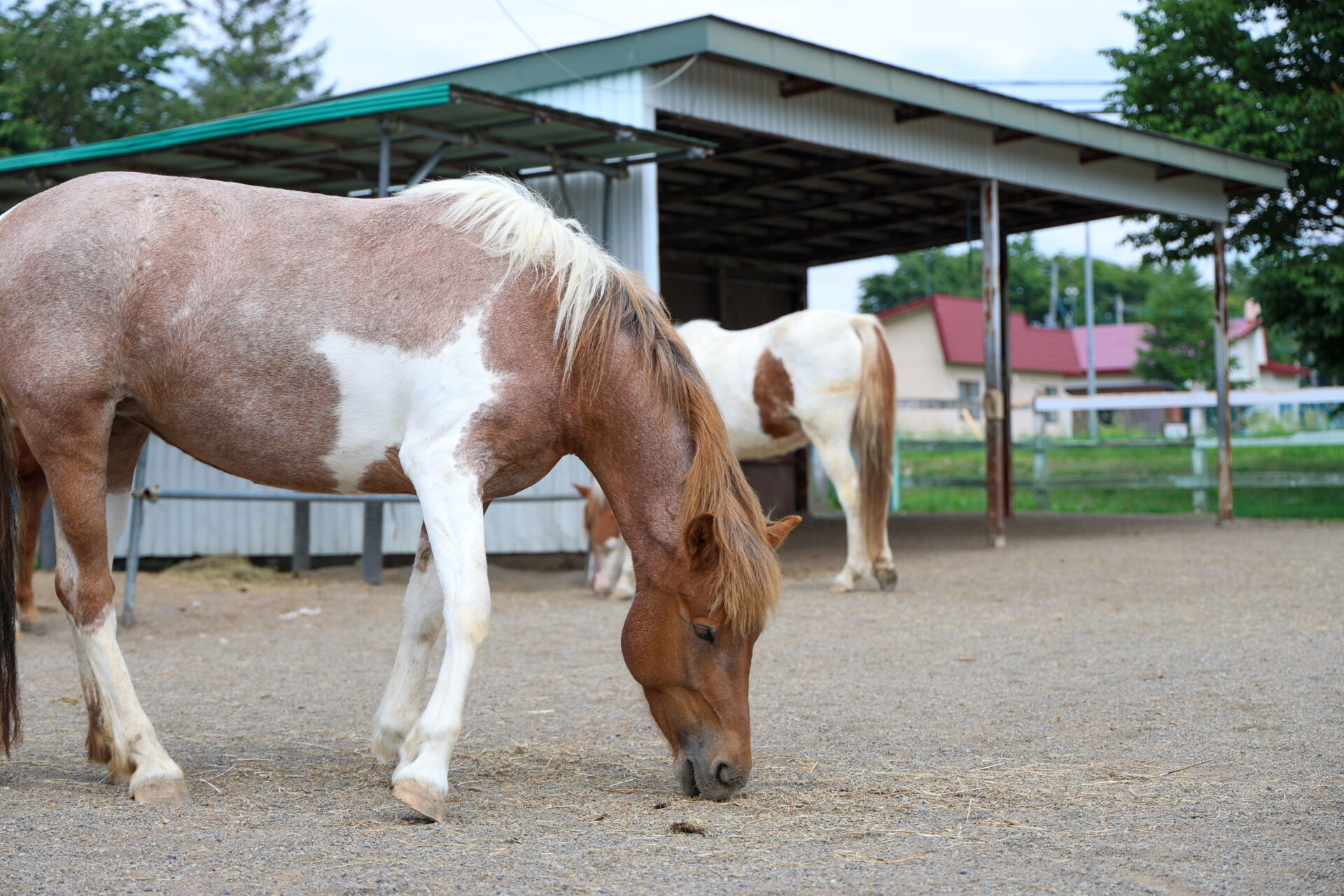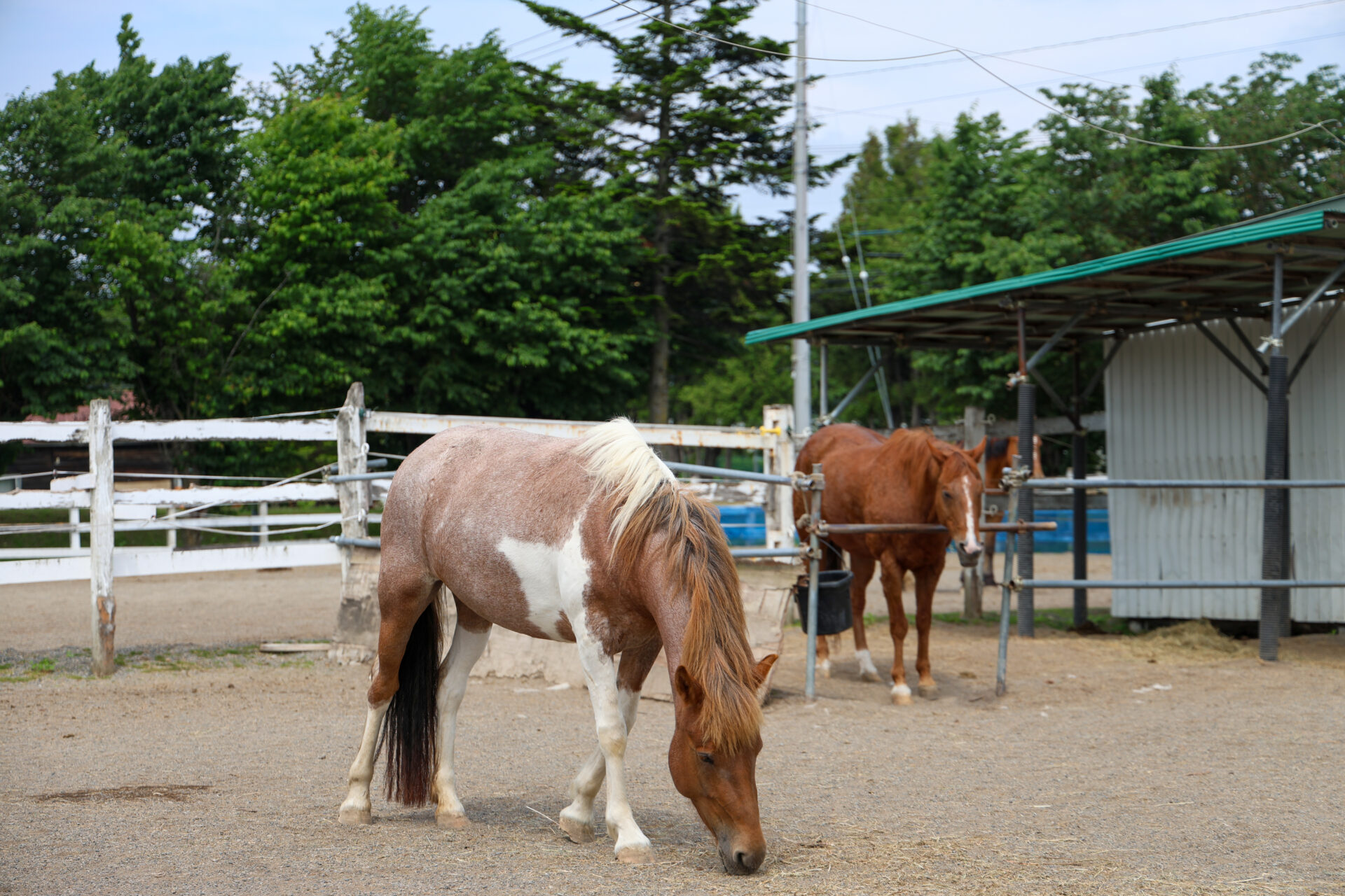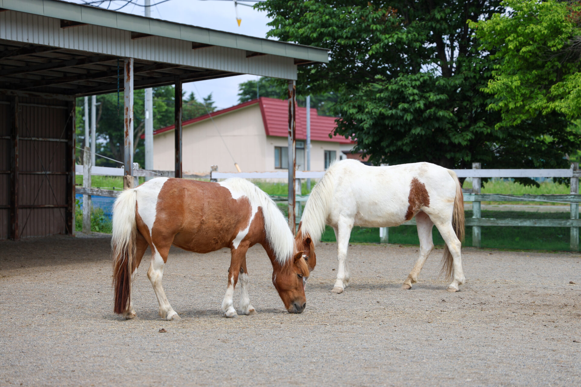 パーク内では様々な馬たちに出会えます。茶色と白のまだら模様が美しいペイントホースや、のんびりと草を食む姿に癒されます。