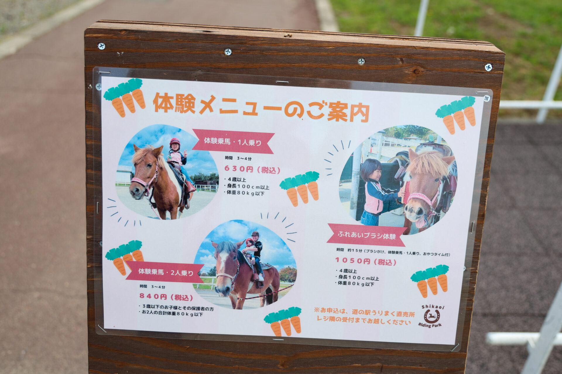 乗馬体験は初心者でも安心して参加できます。体験乗馬・1人乗り(3~4分)は630円、体験乗馬・2人乗りは840円、ふれあいブラシ体験(約15分、ブラシがけ・体験乗馬・1人乗り・おやつタイム付)は1,050円で楽しめます。4歳以上、身長100cm以上、体重80kg以下の方が対象です。申込は道の駅うりまく直売所のレジ横受付まで。