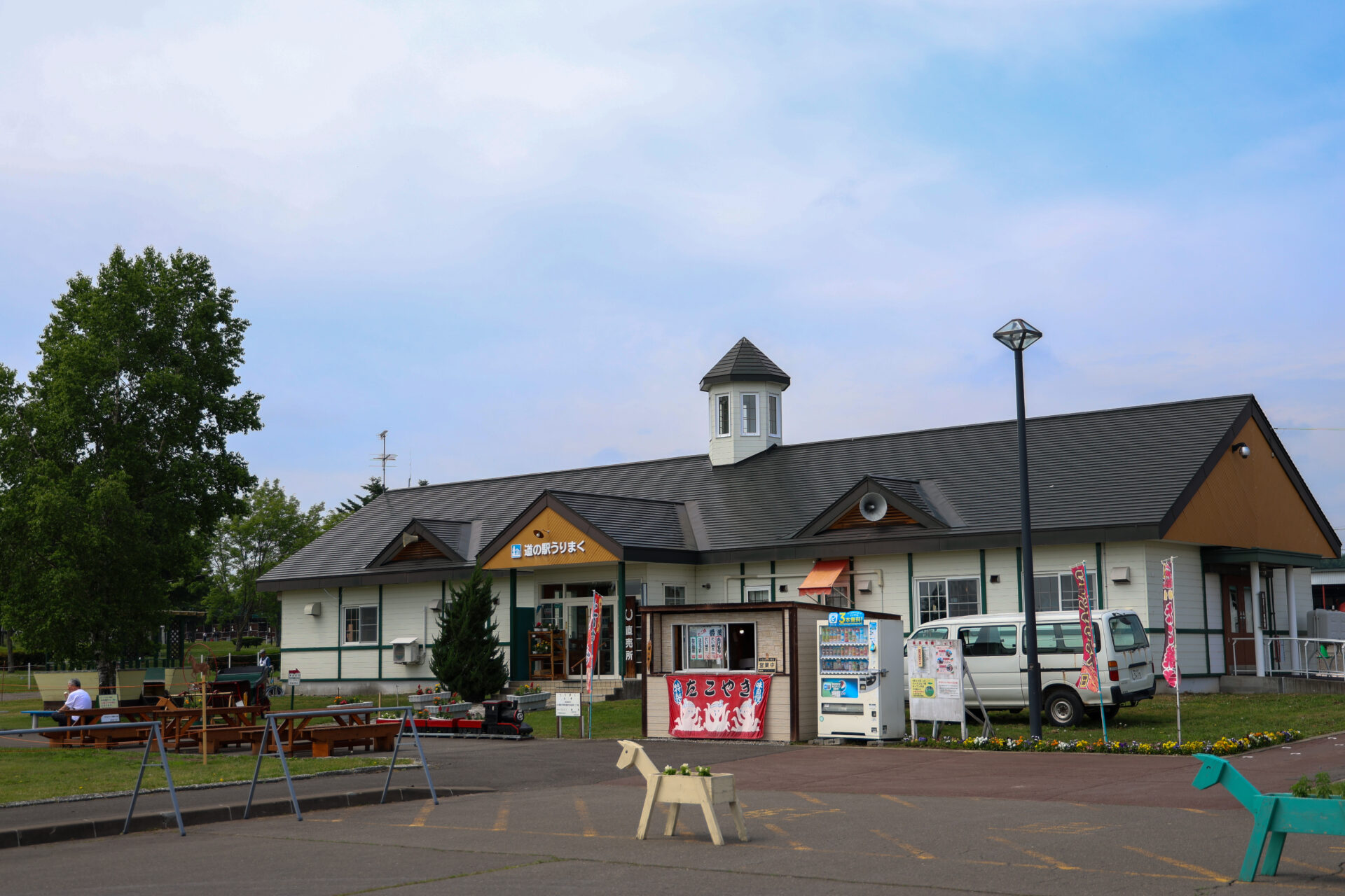国道274号線沿いに位置する道の駅うりまく。白とオレンジを基調とした可愛らしい建物で、三角屋根の塔がシンボルとなっています。敷地内には木製の馬のオブジェが設置されており、乗馬ができる道の駅らしい雰囲気が漂っています。