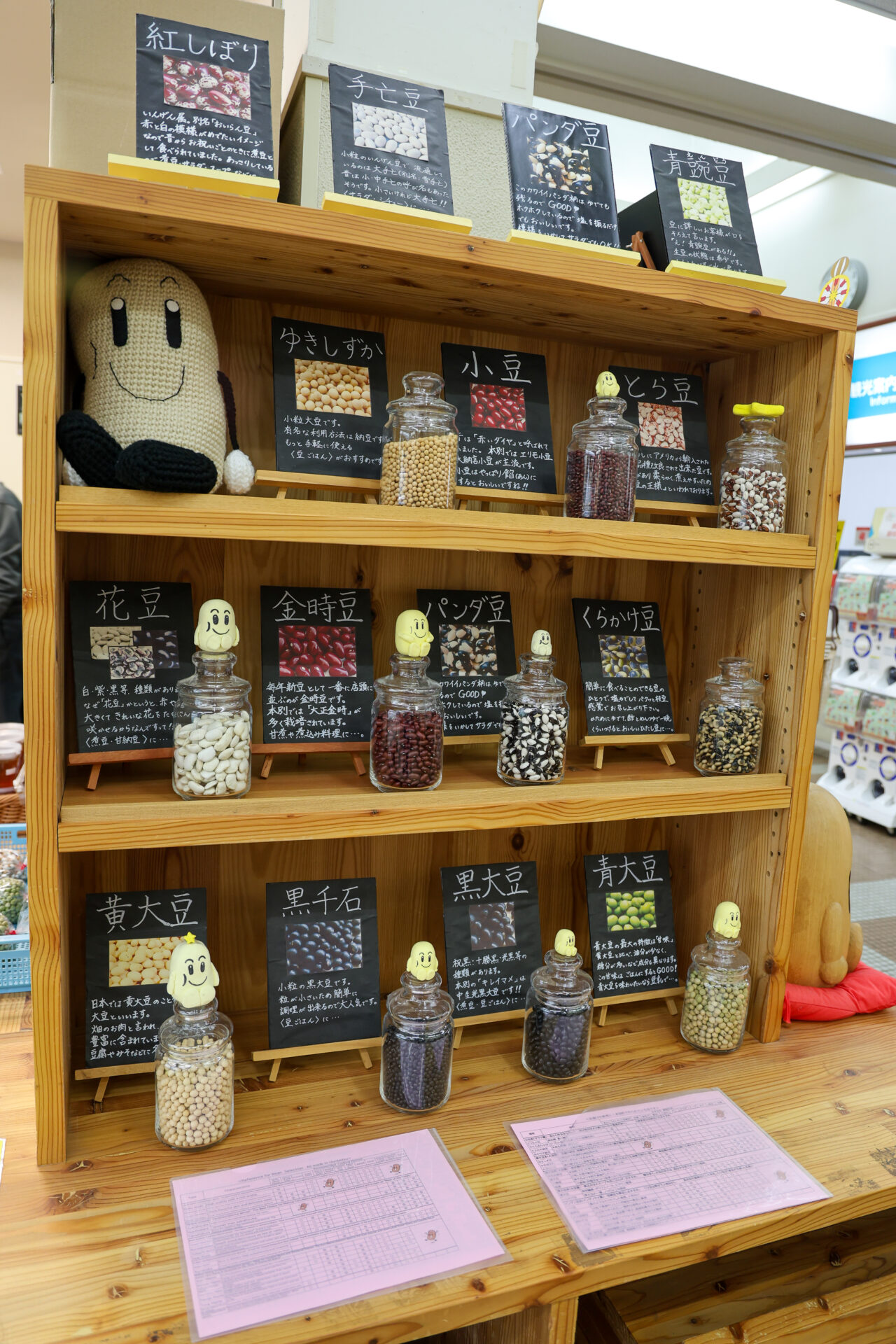 本別町は「日本一の豆のまち」として知られています。売店では様々な種類の豆が展示・販売されており、紅しぼり、手亡豆、パンダ豆、青鷹豆、ゆきしずか、小豆、とら豆、花豆、金時豆、くらかけ豆、黄大豆、黒千石、黒大豆、青大豆など、多彩な豆の種類を見ることができます。特に本別産の黒豆「光黒大豆」を使った「キレイマメ」ブランドは、安心・安全・美味しさにこだわった本別を代表する特産品です。