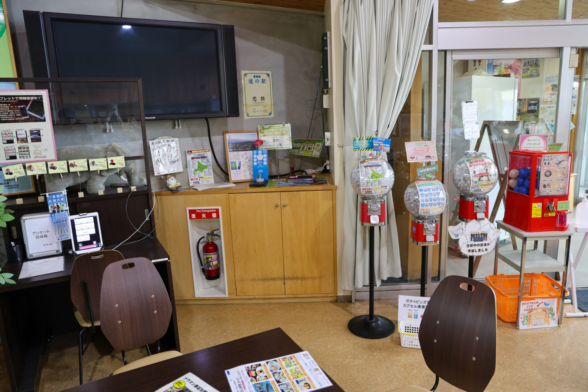 施設内の情報コーナーにスタンプが設置されています。ガチャガチャや道の駅スタンプラリーの案内パネルと一緒に配置されており、すぐに見つけられます。
